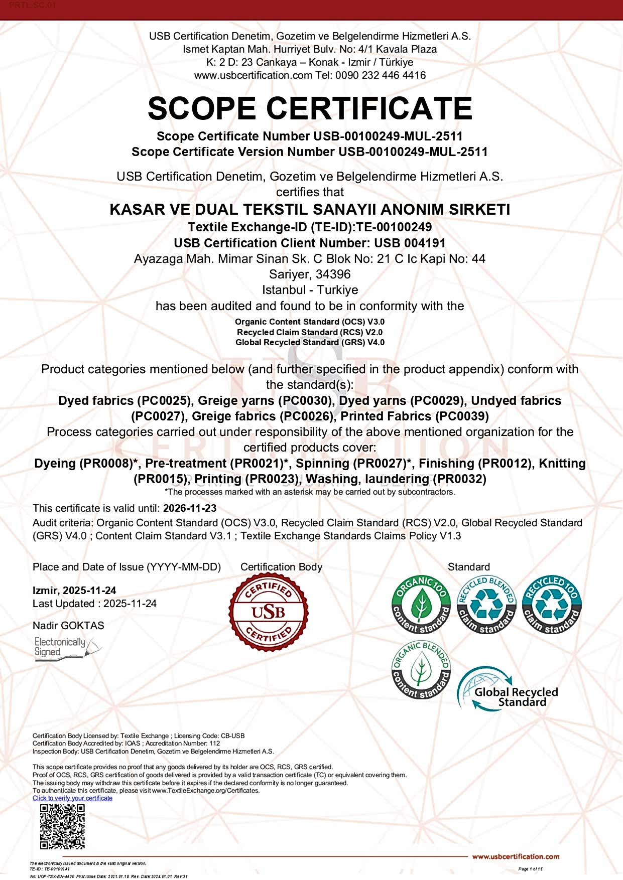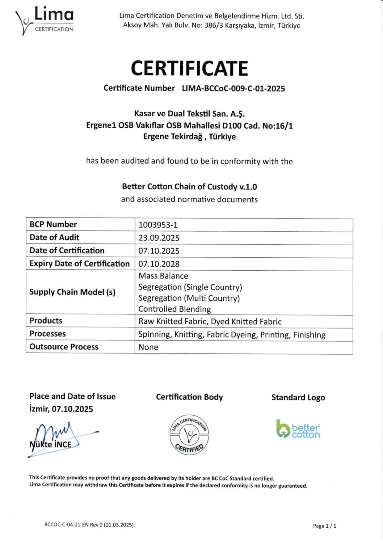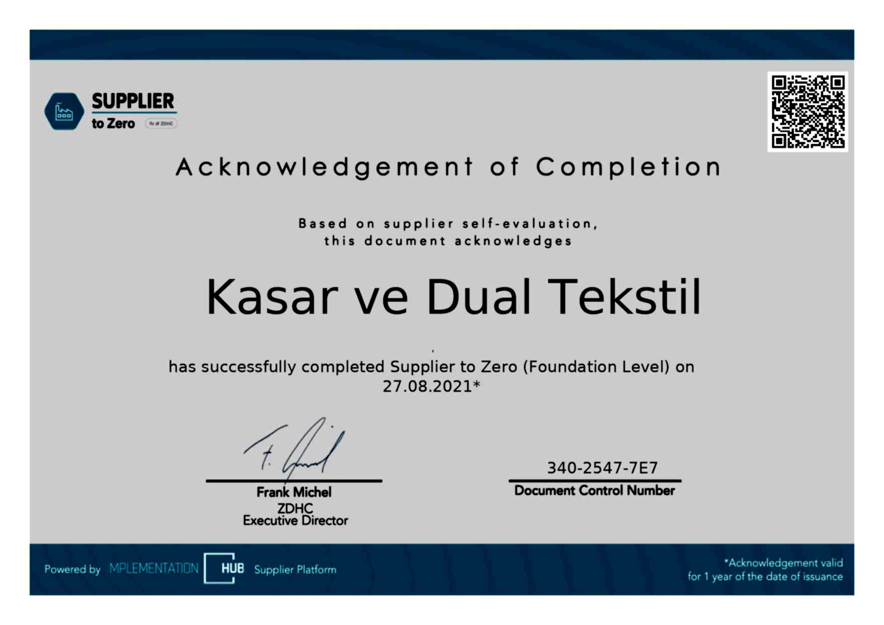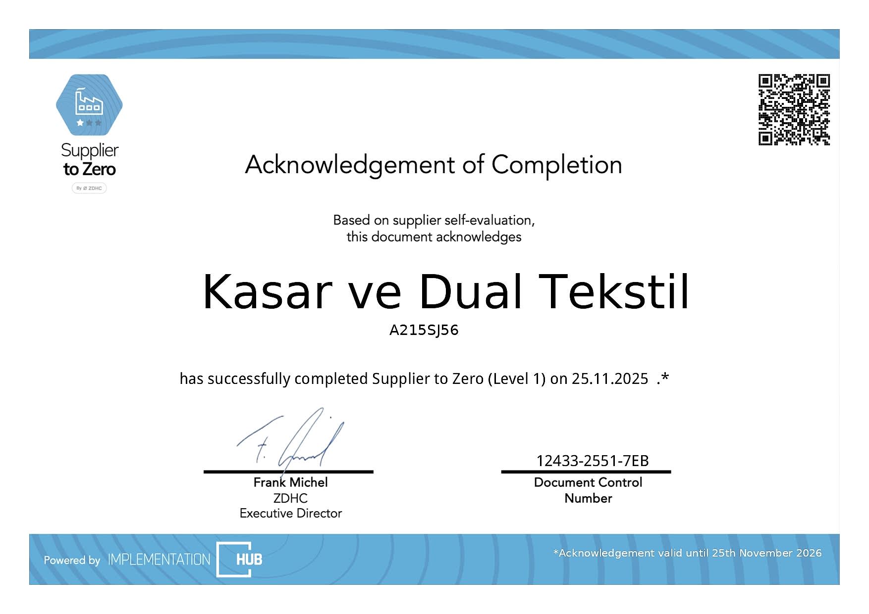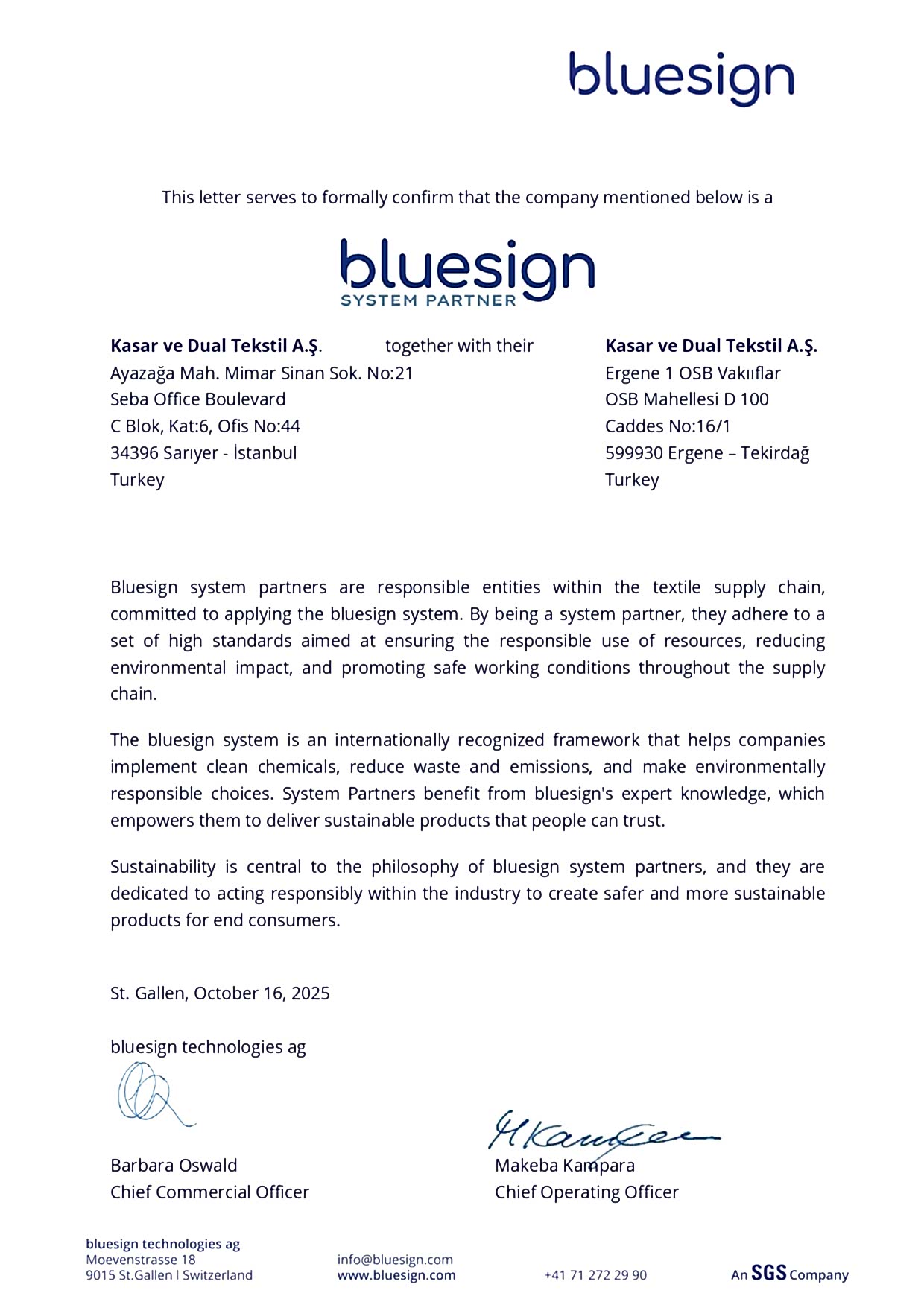 Kasar ve Dual Tekstil San. A.Ş., yaptığı tüm faaliyetler kapsamında doğa ile uyum içinde yaşamayı felsefe edinerek,