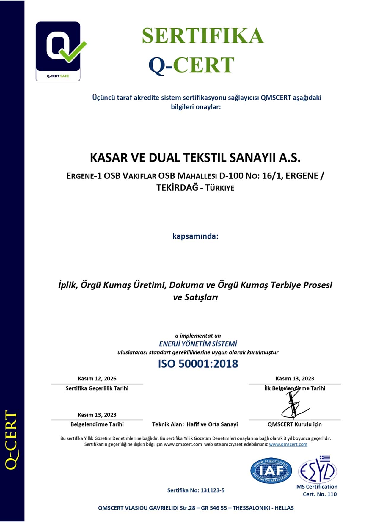Kasar ve Dual Tekstil San. A.Ş., enerji kullanımının sorumluluğunu taşıma bilinci içinde enerji performansını sürekli iyileştirmeyi, faaliyetlerimizi çevresel ve ekonomik açıdan sürdürülebilir kılmayı hedefleyerek;